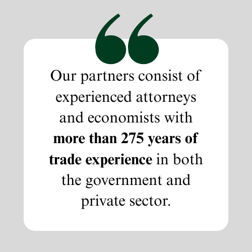 Its partners consist of experienced attorneys and economists with more than 275 years of trade experience in both the government and private sector.